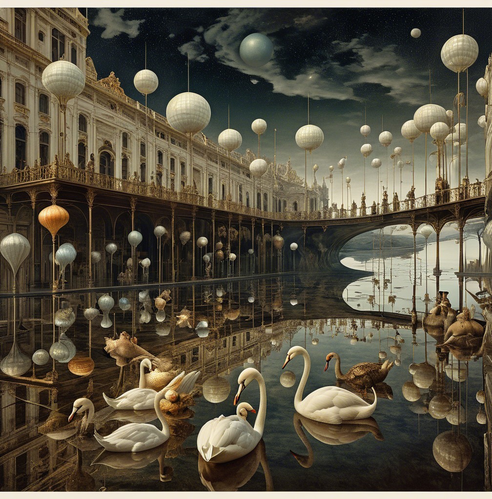 A serene scene features a grand, ornate building reflected in calm waters. A bride in a flowing white dress stands gracefully on a wooden platform, accompanied by elegant swans and lanterns above.