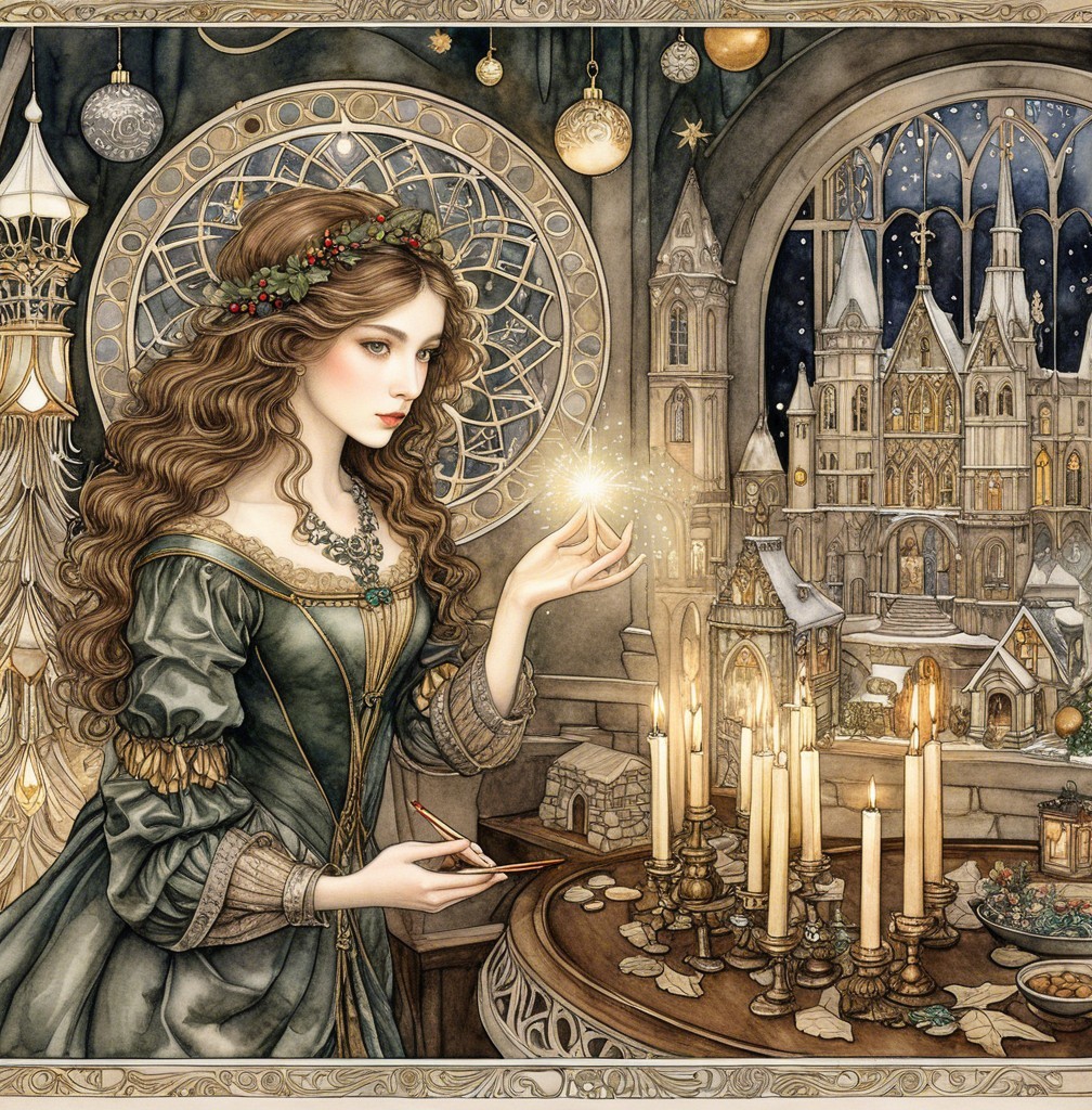 Two young girls with flowing hair stand by a table adorned with candles, gazing out a window decorated for Christmas. A beautifully lit tree sparkles nearby, enhancing the festive atmosphere.