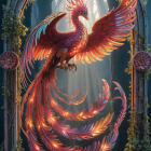 A vibrant phoenix with iridescent red and orange feathers soars gracefully through a beautifully ornate archway, surrounded by lush greenery and blooming pink flowers, illuminated by soft sunlight.