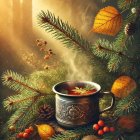A warm mug steams in a serene autumn forest, surrounded by colorful fallen leaves, pinecones, and berries. The golden hues of the trees create an inviting, tranquil atmosphere.