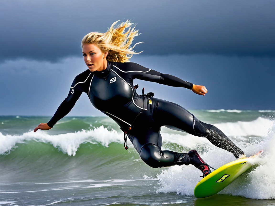 Prompt: "Blonde female kitesurfer, youthful look, dynamic pose, skin tight, shiny rubber suit, emphasis on body details, kitesurfing in stormy weather, seashore, big surf in the background, lifted into the air by the kite with her surfboard, action-packed scene, adrenaline-filled moment, hair blown by the wind, dramatic lighting effects, strong waves, intense sea colors, , realistic style, dramatic shadows, by an experienced digital artist."