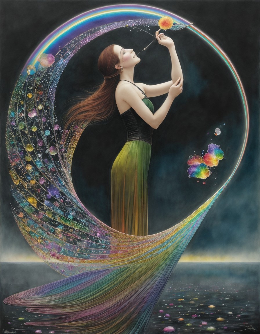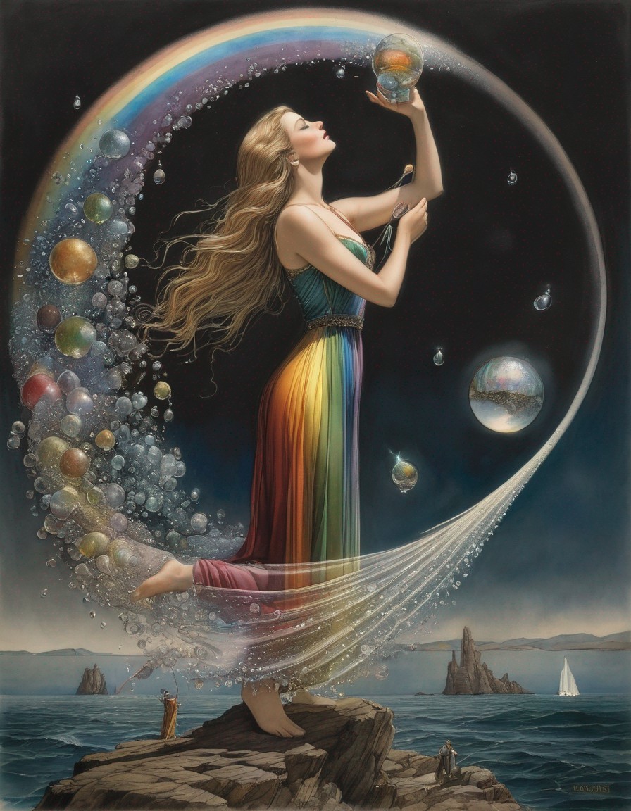 A mythical woman in a colorful dress stands on a rocky outcrop, holding a wand with a sphere; a fantastical castle and cosmic backdrop behind her.
