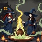 Two witches standing beside a cauldron in a dark, atmospheric setting. The first witch has long red hair and wears a flowing deep blue robe with a matching pointed hat, holding a wand. The second witch has long black hair, dressed similarly, wielding a broom. Green magical smoke swirls around them, emanating from the cauldron, while flames flicker from torches on either side. In the background, a shadowy, mysterious house looms amongst twisted trees, enhancing the enchanting yet eerie ambiance of the scene.