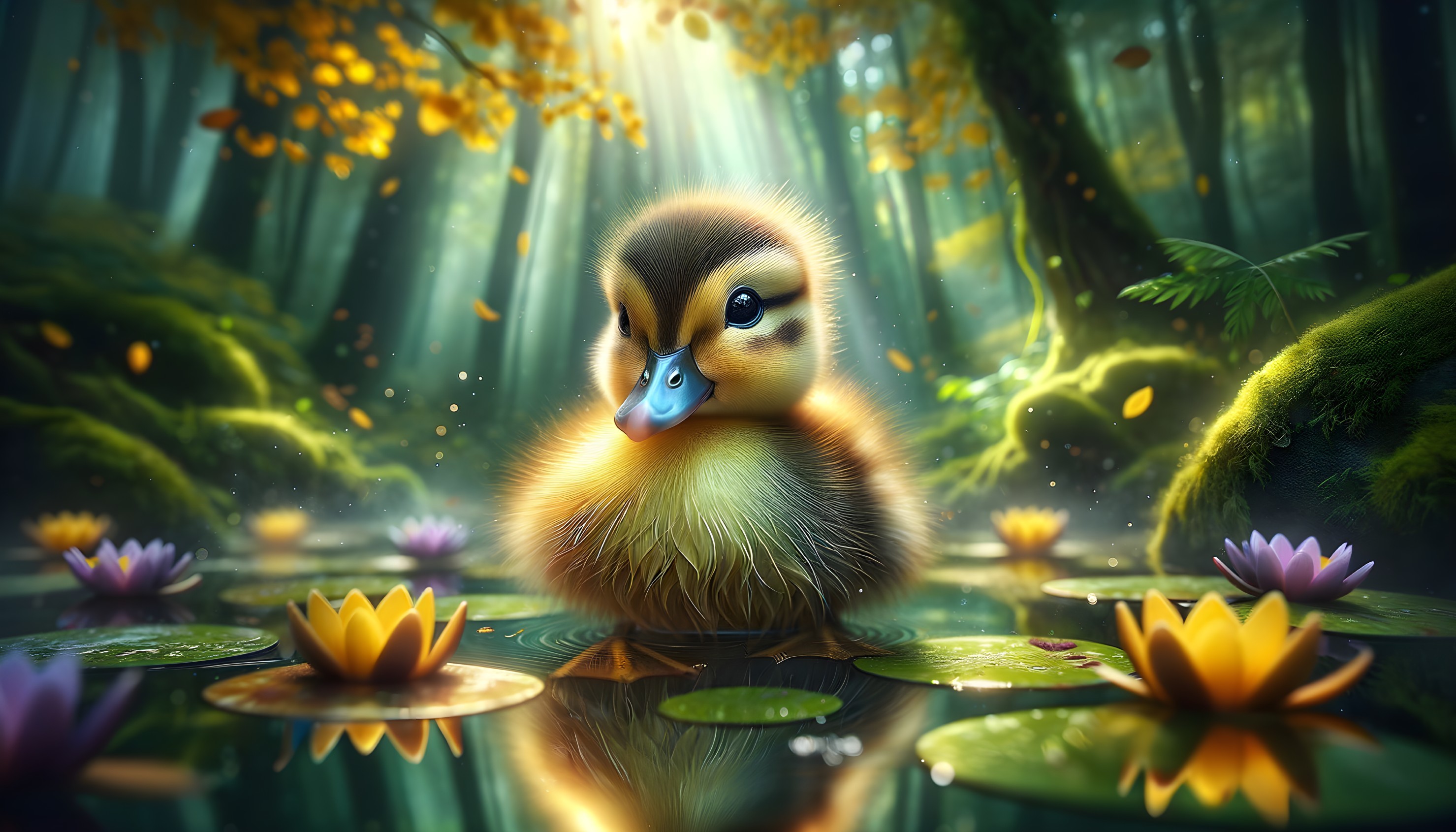 A cute, fluffy duckling sits on a lily pad in an enchanting, sunlit forest with water lilies around.