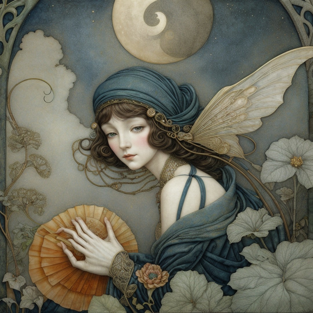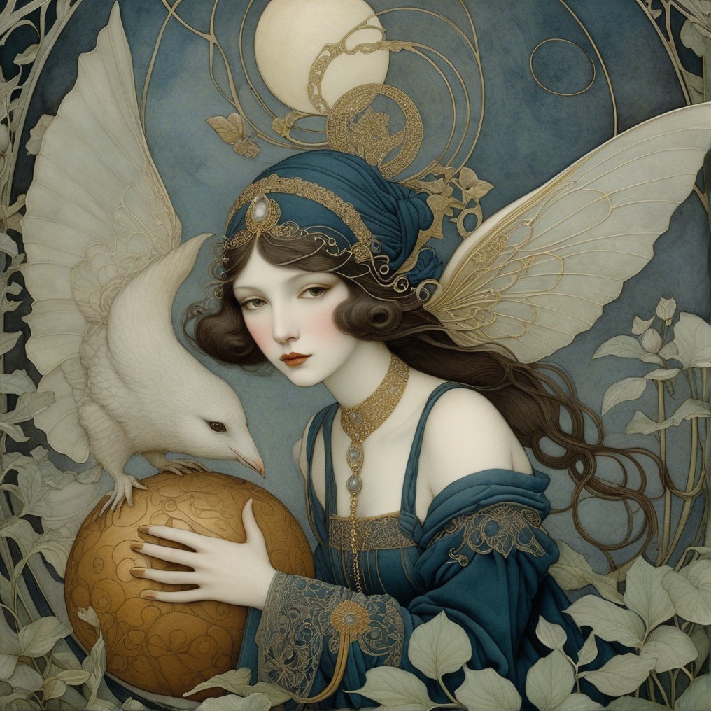 A mystical woman with flowing hair, adorned in an ornate blue gown, holds a golden orb while a white dove perches beside her. Elegant patterns and foliage surround her, creating a serene atmosphere.