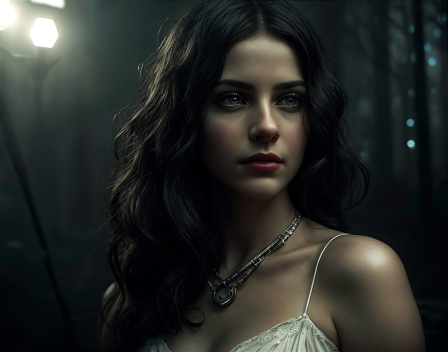 The image features a woman with long, dark hair and striking blue eyes, wearing a delicate outfit and an ornate necklace. The soft lighting creates a dramatic and emotive atmosphere.