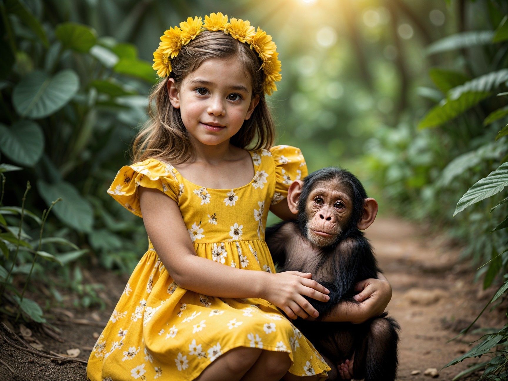 A young girl in a yellow dress adorned with flowers sits in a lush green setting, gently holding a baby chimpanzee on her lap, both appearing calm and connected in nature.