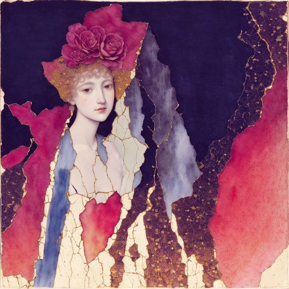 The artwork features a serene figure with a floral crown, set against a backdrop of cracked, colorful patterns. The soft expression and contrasting textures create a dreamlike atmosphere.