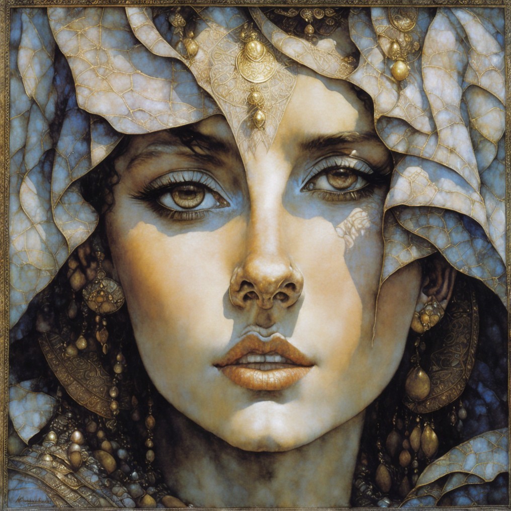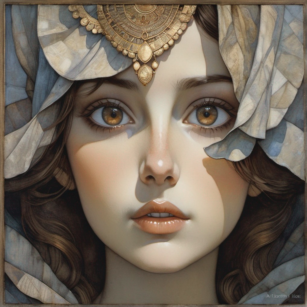 A close-up portrait of a woman with striking hazel eyes, wearing a sheer veil over her head. Her gaze is direct and captivating.