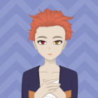 A cozy bedroom features a character with red hair lying in bed, gazing out a large circular window. A vibrant sunrise casts an orange glow over a bustling city skyline. Soft lighting adds warmth.
