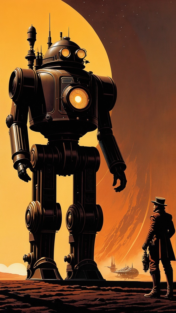 A towering, retro-futuristic robot stands against a vibrant sunset, while a man in a top hat gazes up. Spacecraft can be seen in the background, creating an atmosphere of adventure and wonder.