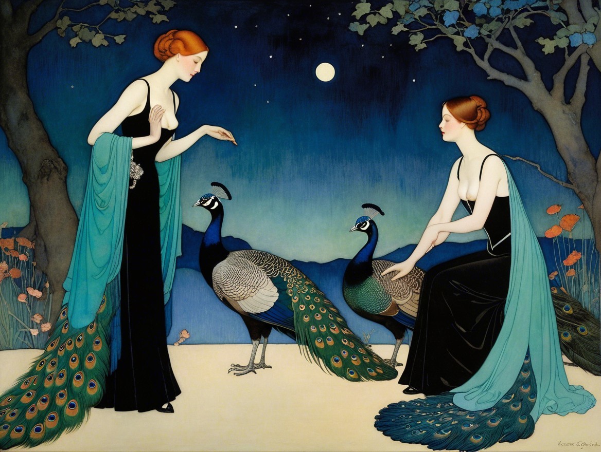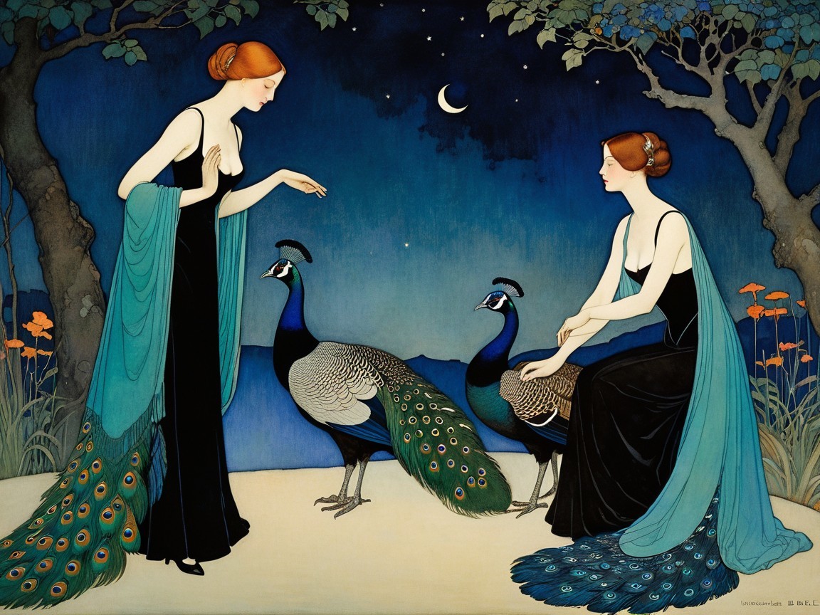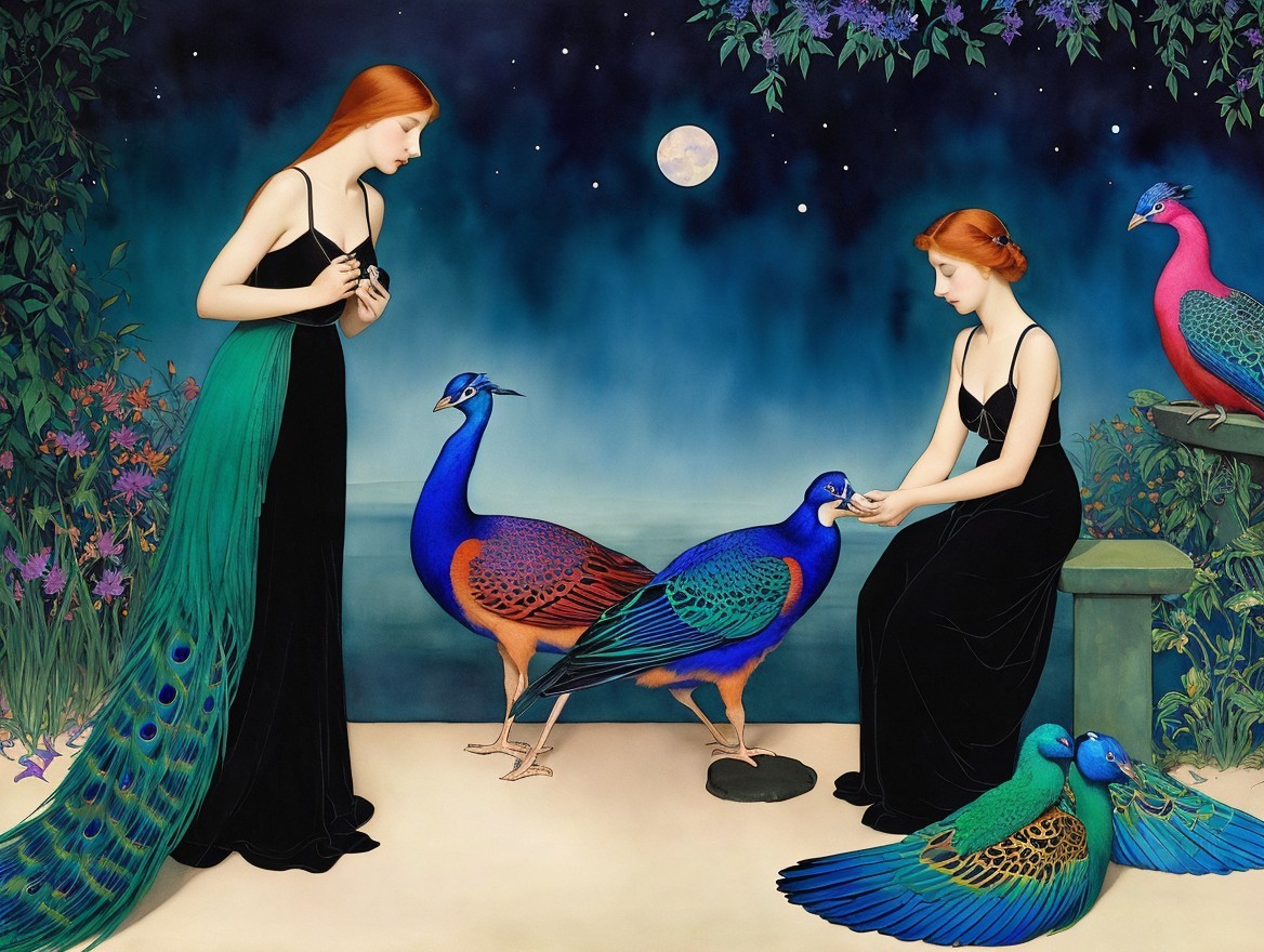 Two elegantly dressed women in black gowns interact with a majestic peacock under a twilight sky. The scene is adorned with lush foliage and a serene landscape in the background.