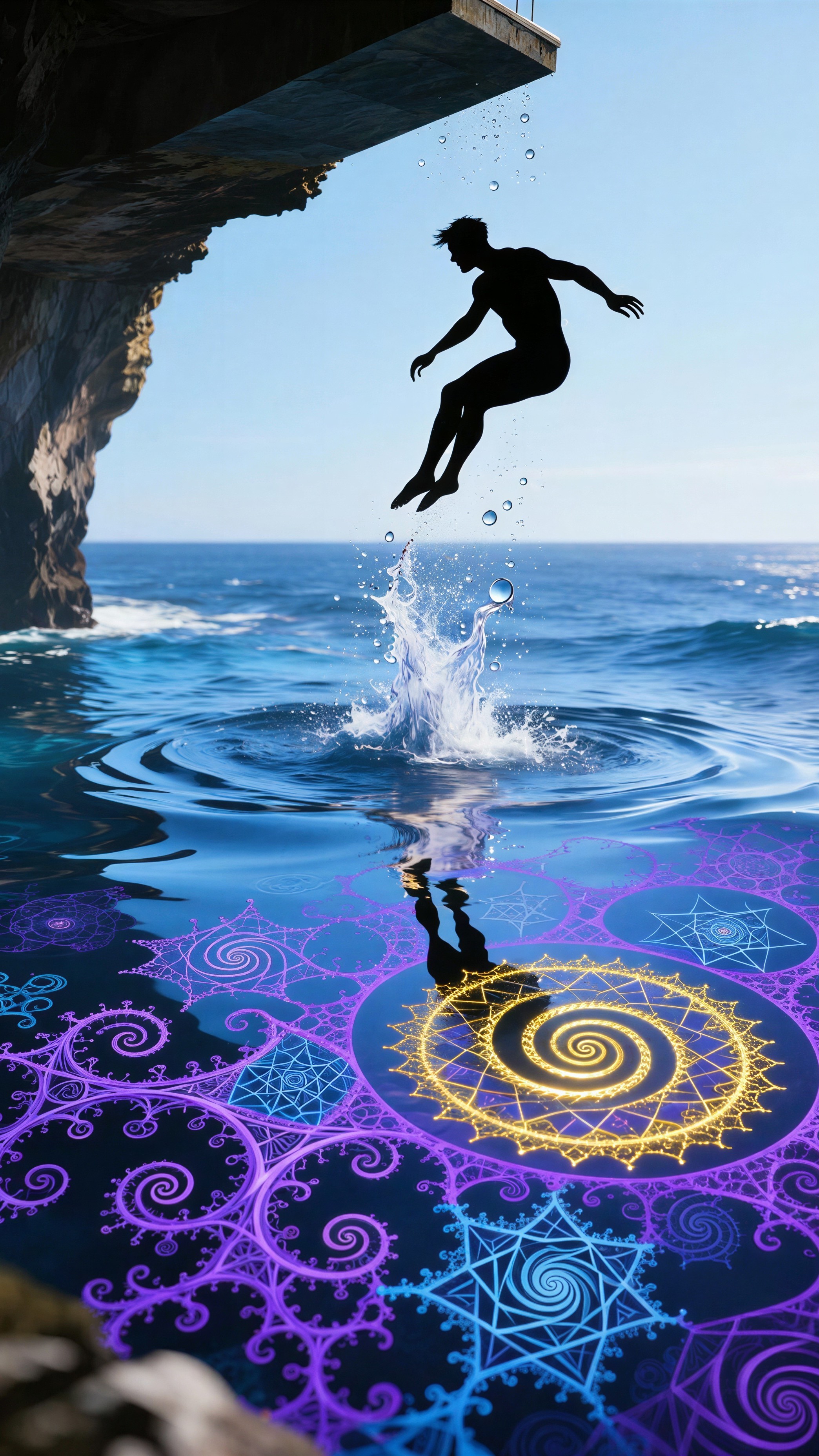 A vibrant, high-angle outdoor shot on an overcast day shows the silhouette of a male human doing a running jump at a cliff into the ocean creating a beautiful water splash. The ocean has beautiful fractal swirl patterns, glowing in various shades of purple, blue, and gold, and resembling mandalas,
