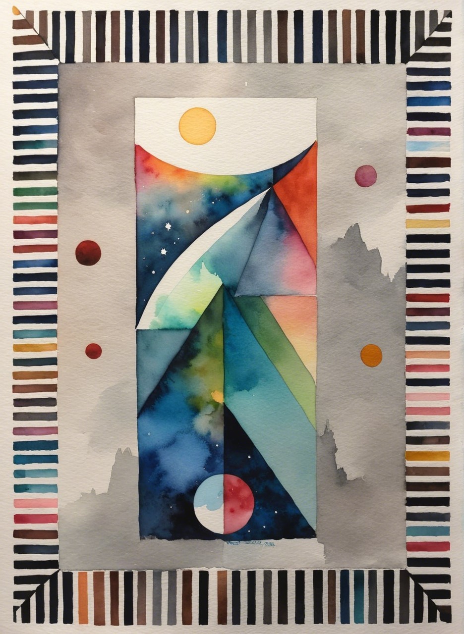 A watercolor painting with an abstract geometric design, featuring a central rectangle filled with vibrant blues, greens, reds, and oranges, resembling a cosmic landscape with stars and planets. The main rectangle has a semicircular section at the top with a yellow circle, and another at the bottom with a red and