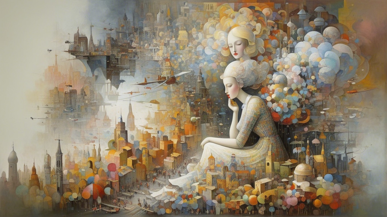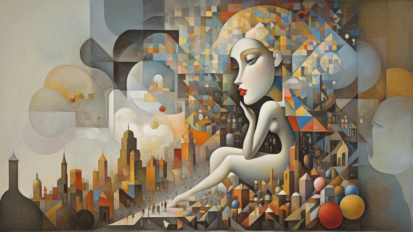 A vibrant, abstract artwork features a cityscape within a stylized human profile. Geometric shapes and colors blend harmoniously, with a sun illuminating the scene, conveying a sense of harmony.