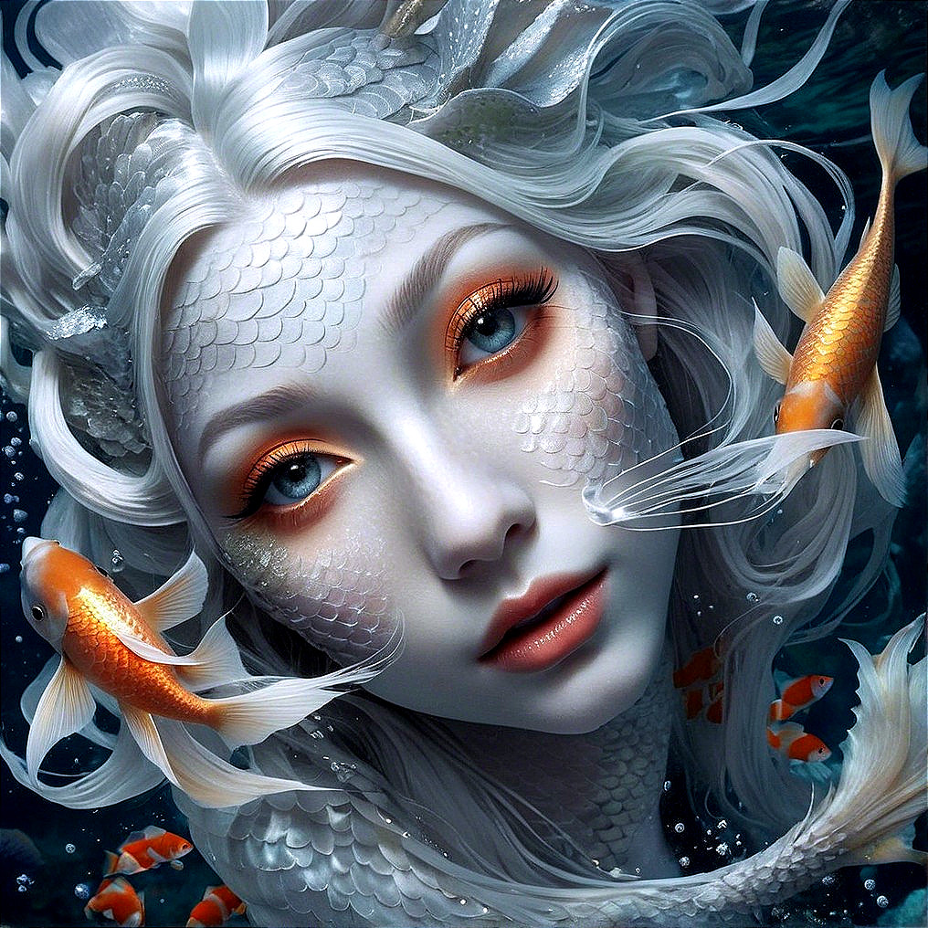 A serene underwater scene featuring a mermaid with iridescent scales, flowing white hair, and captivating blue eyes, surrounded by colorful goldfish in a tranquil atmosphere.