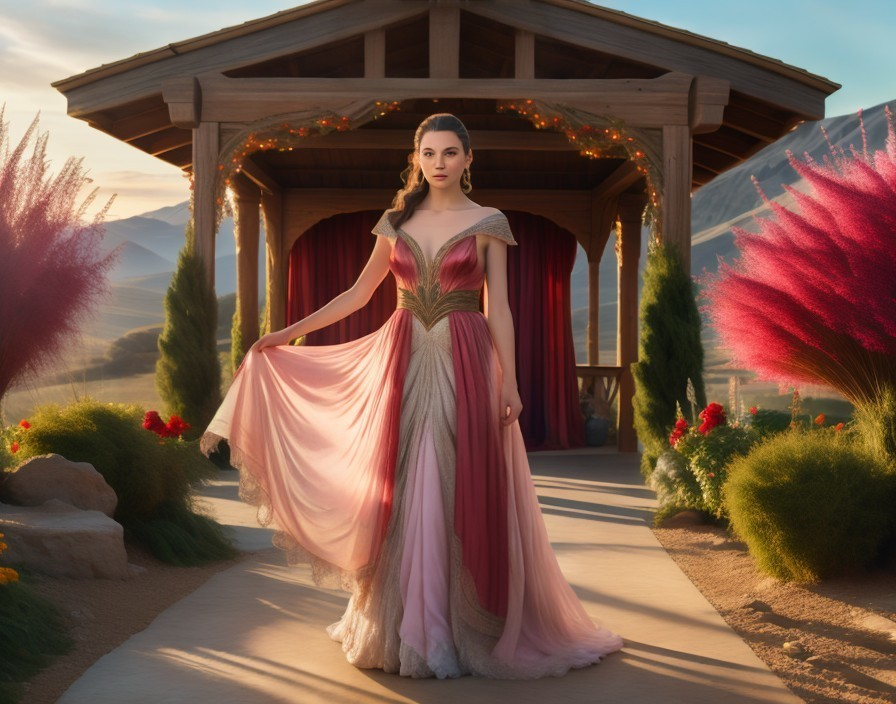 A woman in an elegant gown stands under a gazebo amid a serene landscape with vibrant, colorful plants at golden hour.