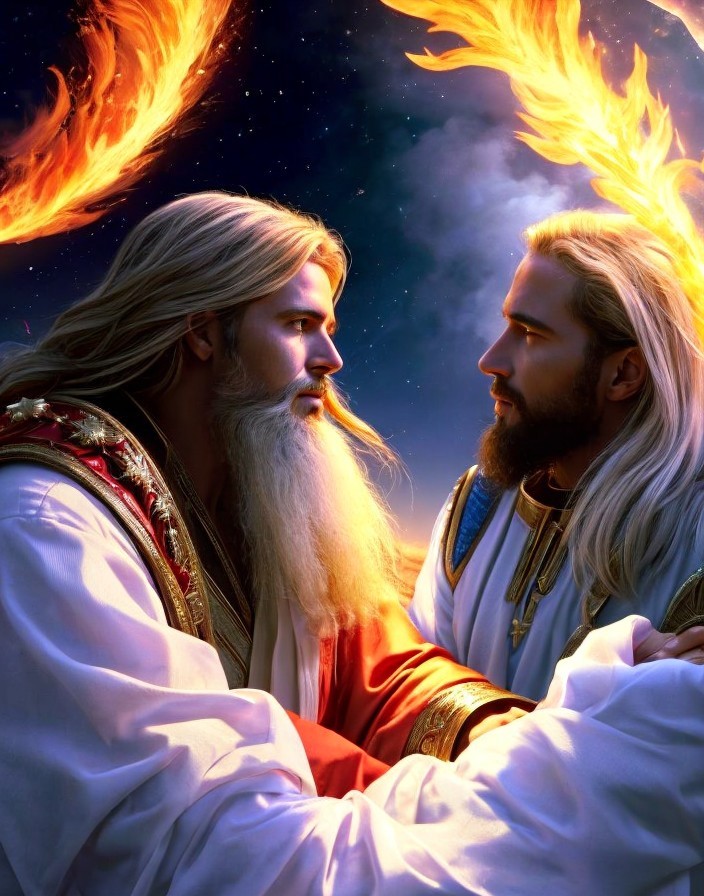 A figure in robes stands atop glowing steps, addressing a crowd under a starry night sky framed by fiery outlines.