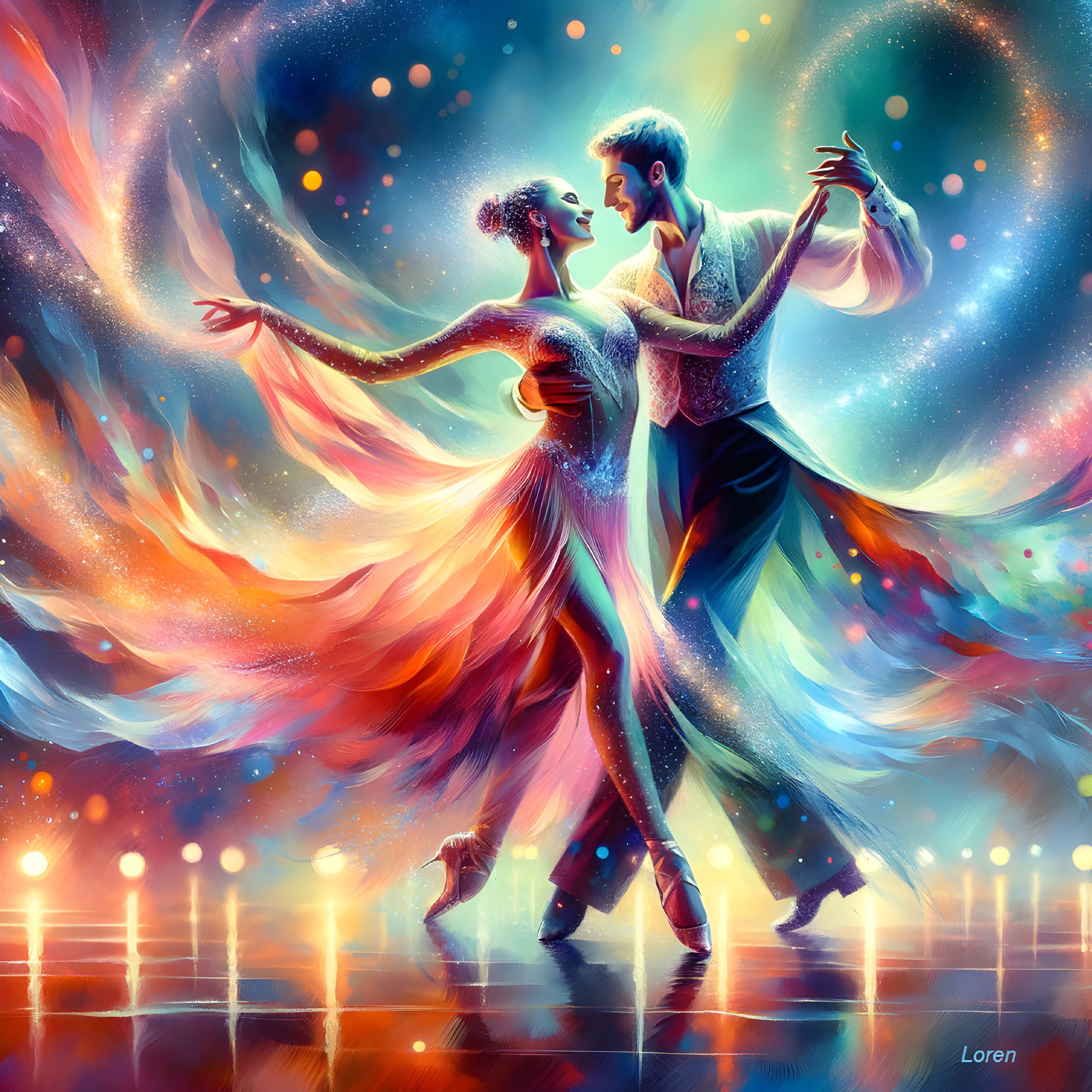 Create a captivating watercolor masterpiece featuring a dazzling dancing couple exuding grace and power. The artwork should be intricate, colorful, and detailed, evoking a serene yet vibrant atmosphere with fantasy elements and an elegant aesthetic.