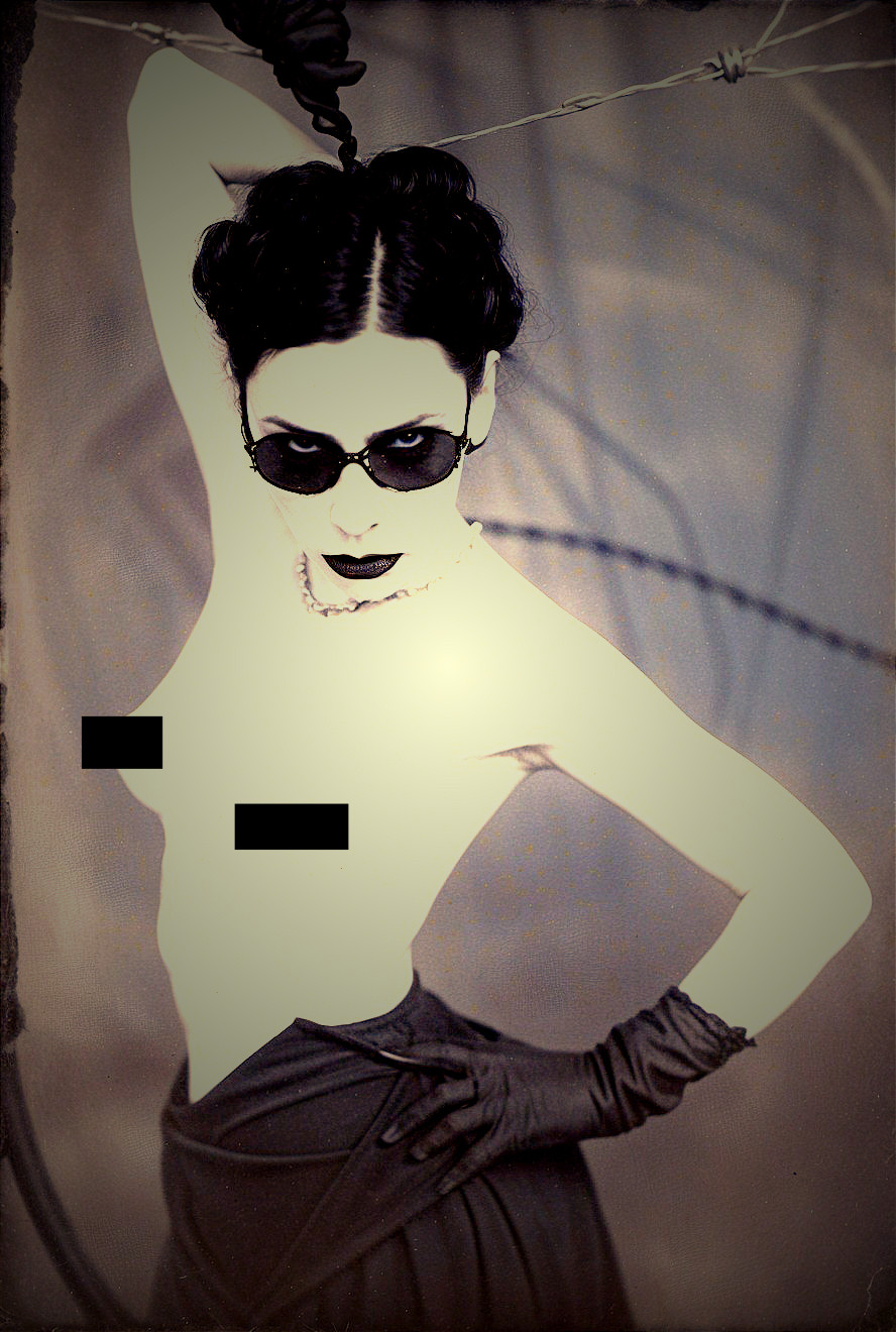A monochromatic artistic portrait features a poised model with dark glasses and gloves, striking a bold pose against a blurred background, exuding elegance and mystery.