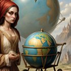A young woman in elegant attire stands beside a decorative globe on wheels, with a larger globe in the background. The scene blends fantasy elements with intricate details in an ancient-like setting.