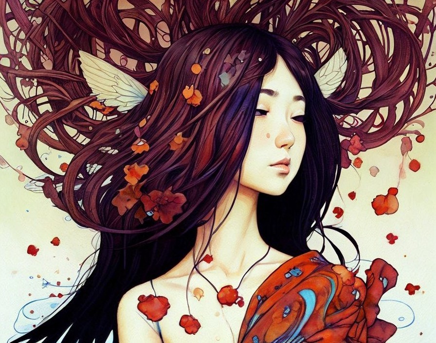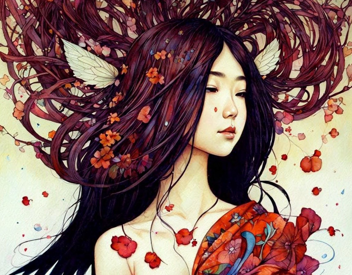 Illustrated female figure with flowing hair and floral adornments.