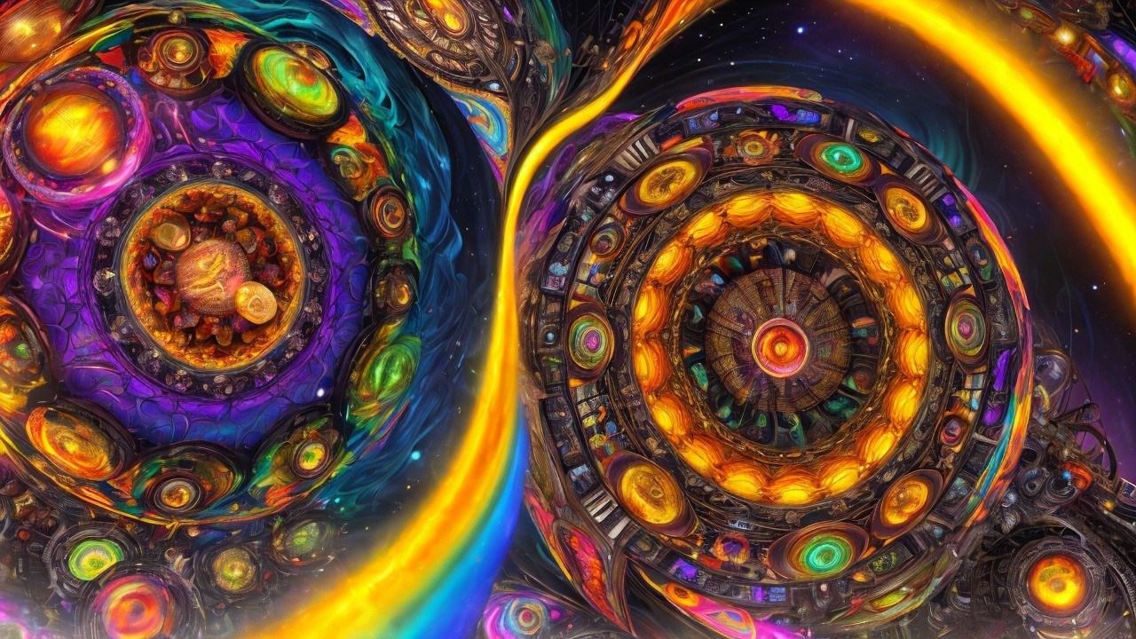 A hyper-detailed background with illustration of psychedelically colored visual effects and shapes. featuring an extremely detailed (((yellow cat's eye))) in the center of the image with intricate mechanical parts. which are merged in a flowing movement with the psychedelic colors dutch angle. as if the fabric of space has been woven into being. Soft, springy strands of escape the universe. The subtle play of starlight on photo shimmers with a mesmerizing, iridescent glow, evoking the hyper-realistic mastery of Robert Zalewski, Ash Thorp and Simon Stalenhag, with intricate textures, nuanced shadows and a deep, dimensionality that draws the viewer into a 3D, curving kaleidoscope of wonder. is rendered in stunning, photorealistic detail, with 16k precision., reflecting the dark, gritty atmosphere of Ash Thorp and Simon Stalenhag’s artwork, while incorporating Zaha Hadid’s futuristic, parametric design, resulting in a haunting and mesmerizing blend of industrial, biomechanical and mystical elements. with fluid curves that evoke the emotional intensity of Egon Schiele’s portraits and the mystical, atmospheric lighting of Zdzisław Beksiński’s surreal landscapes. Captured in stunning 8K resolution, with sharp, realistic detail and a sense of depth,, breathtaking razor sharp close-up A surreal scene featuring a mystical natural phenomenon that gives the impression that space is literally sucking in the Earth, rendered in stunning, photorealistic detail with 16k precision and speed effects as large chunks of the Earth fly around into space
