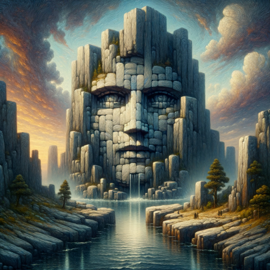 A majestic fantasy landscape with a giant stone face carved into cliffs overlooking a serene river at sunset.