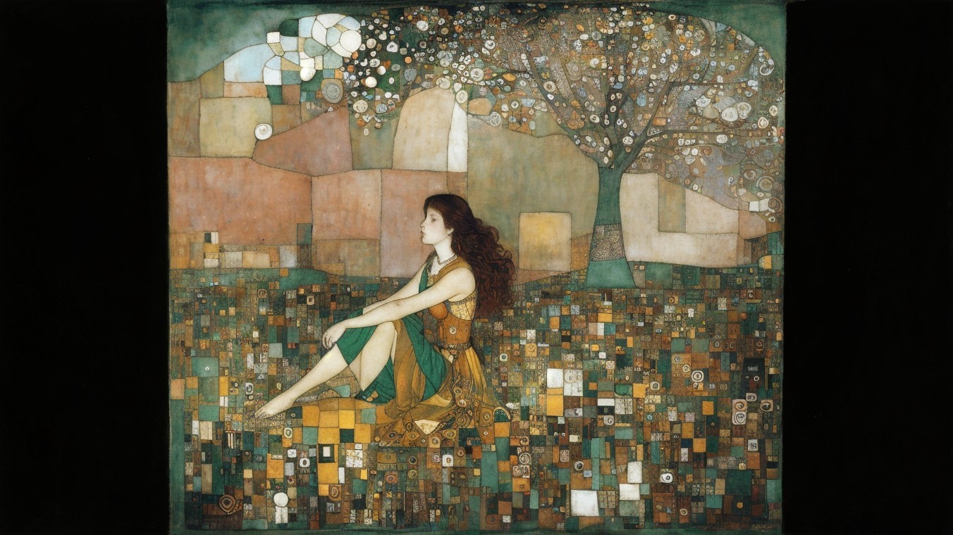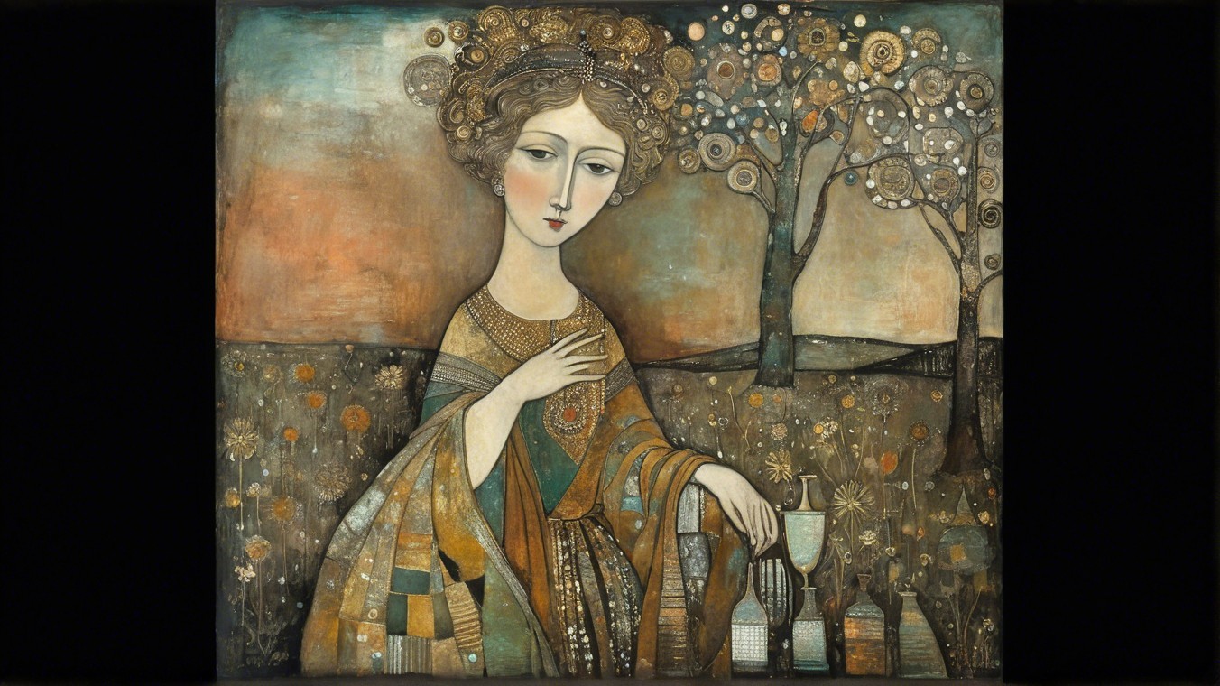 Her portrait. She's an illuminated manuscript that I can't see, in whisky, ochre and verdigris, lost in thoughts that aren't of me, looking down, art brut, somber, desaturated colors, mercury glass patina, Lebanon, in the style of Arthur Rackham, Paul Klee, Gustav Klimt, Honore Daumier