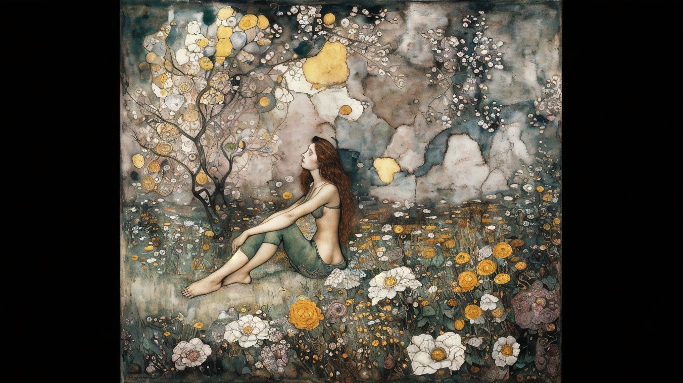 Beautiful girl's portrait in ochre, garden, Copper oxidation patina, Art Brut, moody, somber, desaturated colors, in the style of Paul Klee, Arthur Rackham, Banksy