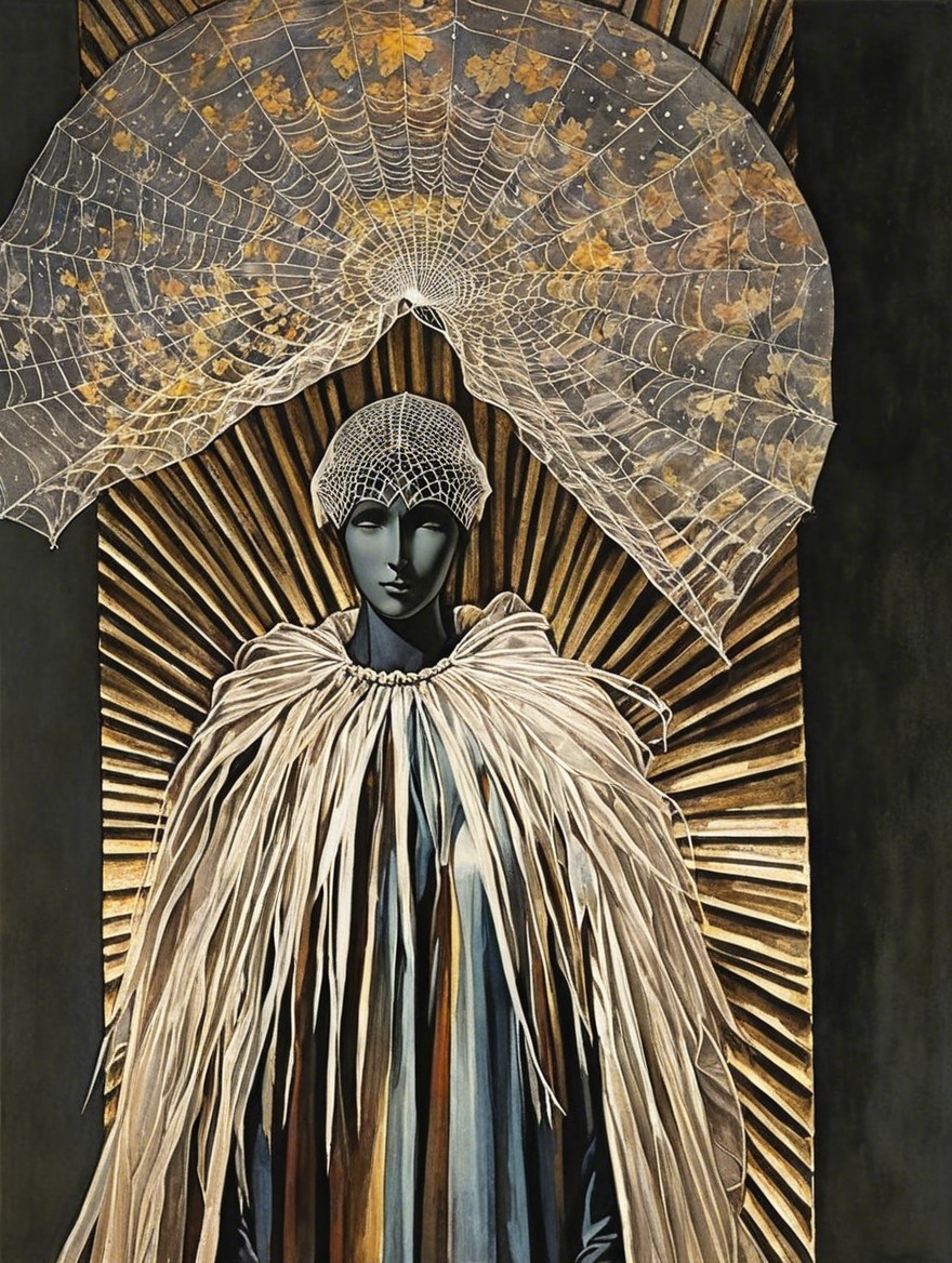 A graceful woman in a black dress and white veil stands in a doorway adorned with spiderwebs. Autumn leaves in shades of orange frame the scene, creating a haunting yet elegant atmosphere.