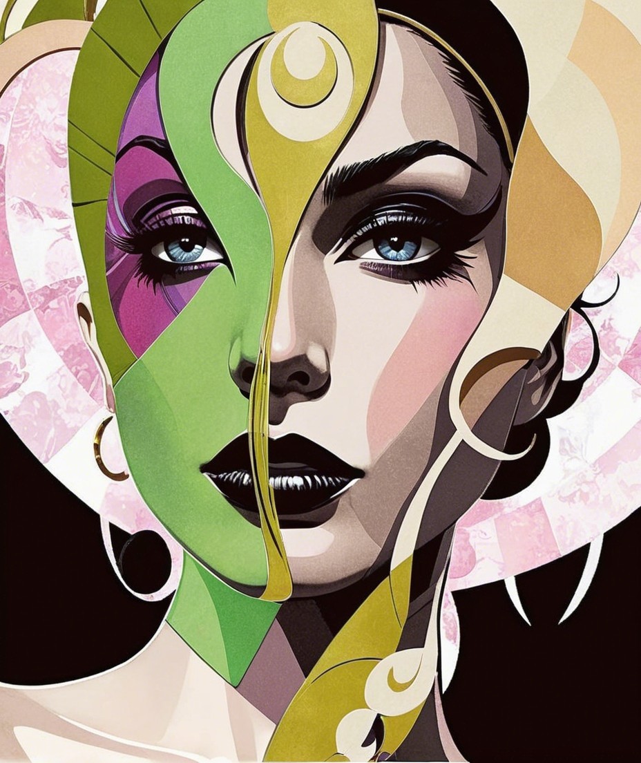 A stylized, colorful portrait of a woman with abstract patterns and striking makeup, blending art deco and modern design elements.