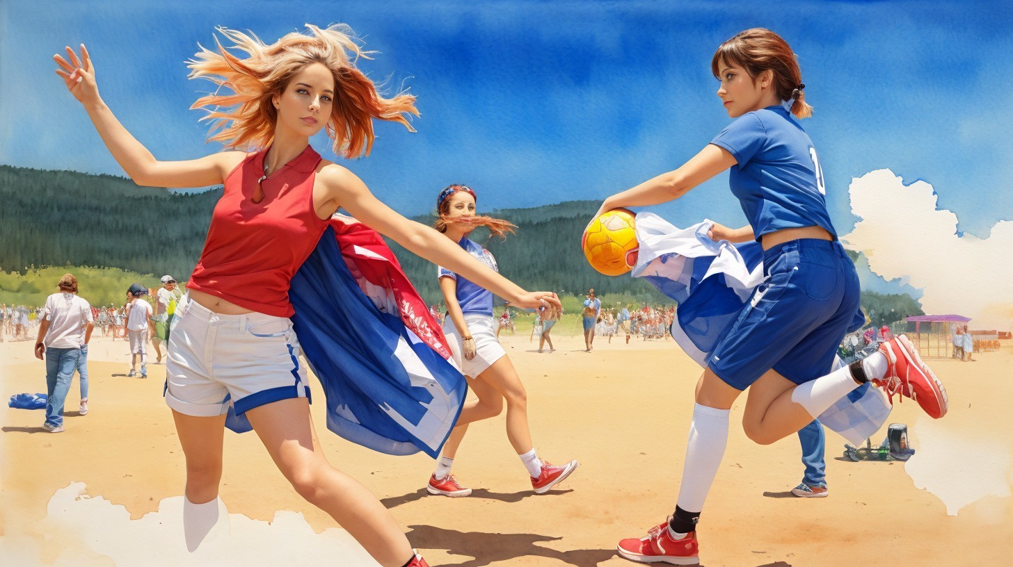 Several young women are playing soccer on a sandy beach. On the left a fair-skinned woman, seen from the waist up, with blonde hair that is flying around her head and shoulders, is wearing a red sleeveless top, white shorts, and white knee socks.