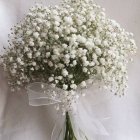 A large, elegant bouquet filled with round clusters of white flowers, complemented by lush green leaves. The arrangement is artistically presented with a ribbon, resting on a wooden surface.