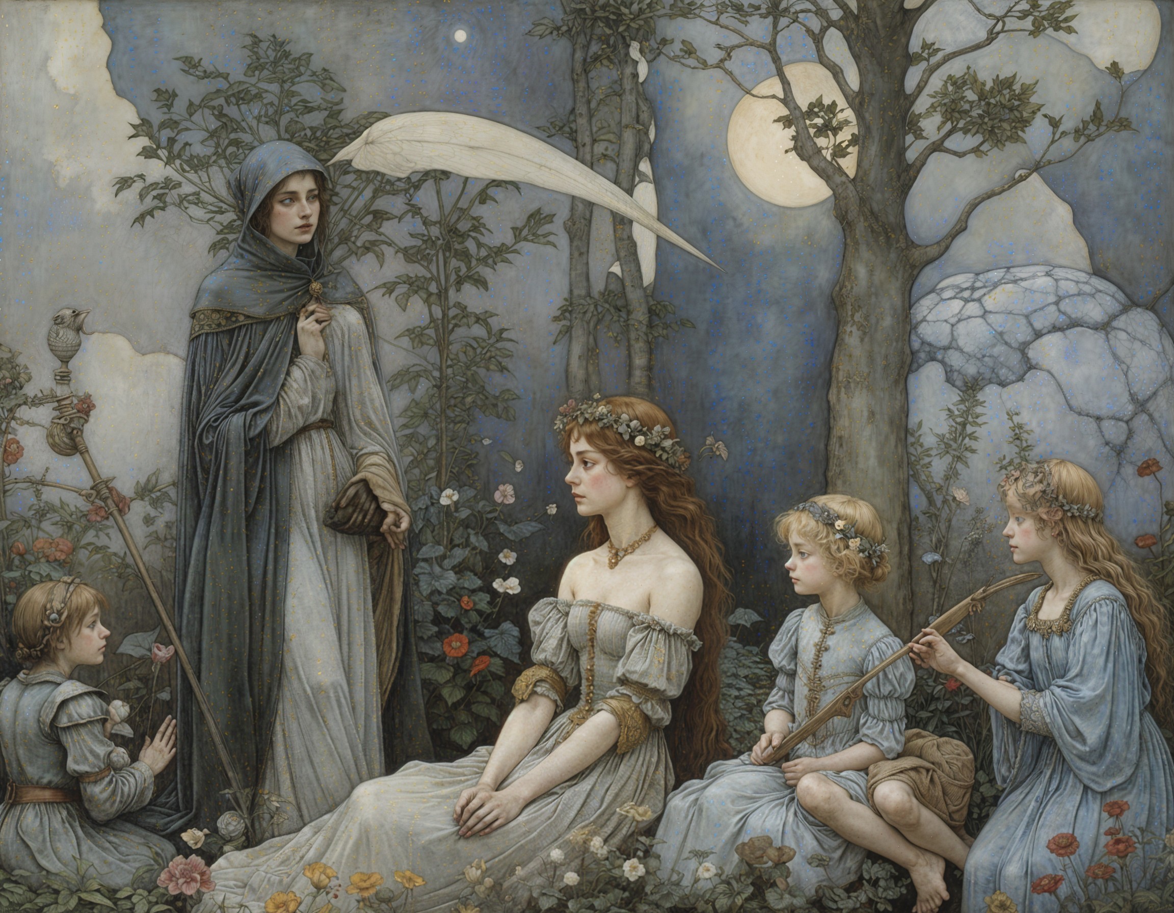 all sides sides view shots of a beautiful abrasive of the (cosmic magical mystical medieval garden:1.3), by (Arthur Rackham and Edward Deakin, Michael Parkes:0.8), (Tempera and depiction:0.8), 16:9, (painting: Anton Mauve and Enki Bilal Edward Gorey, junji ito, klimnt , gold leaf color, silver leaf color