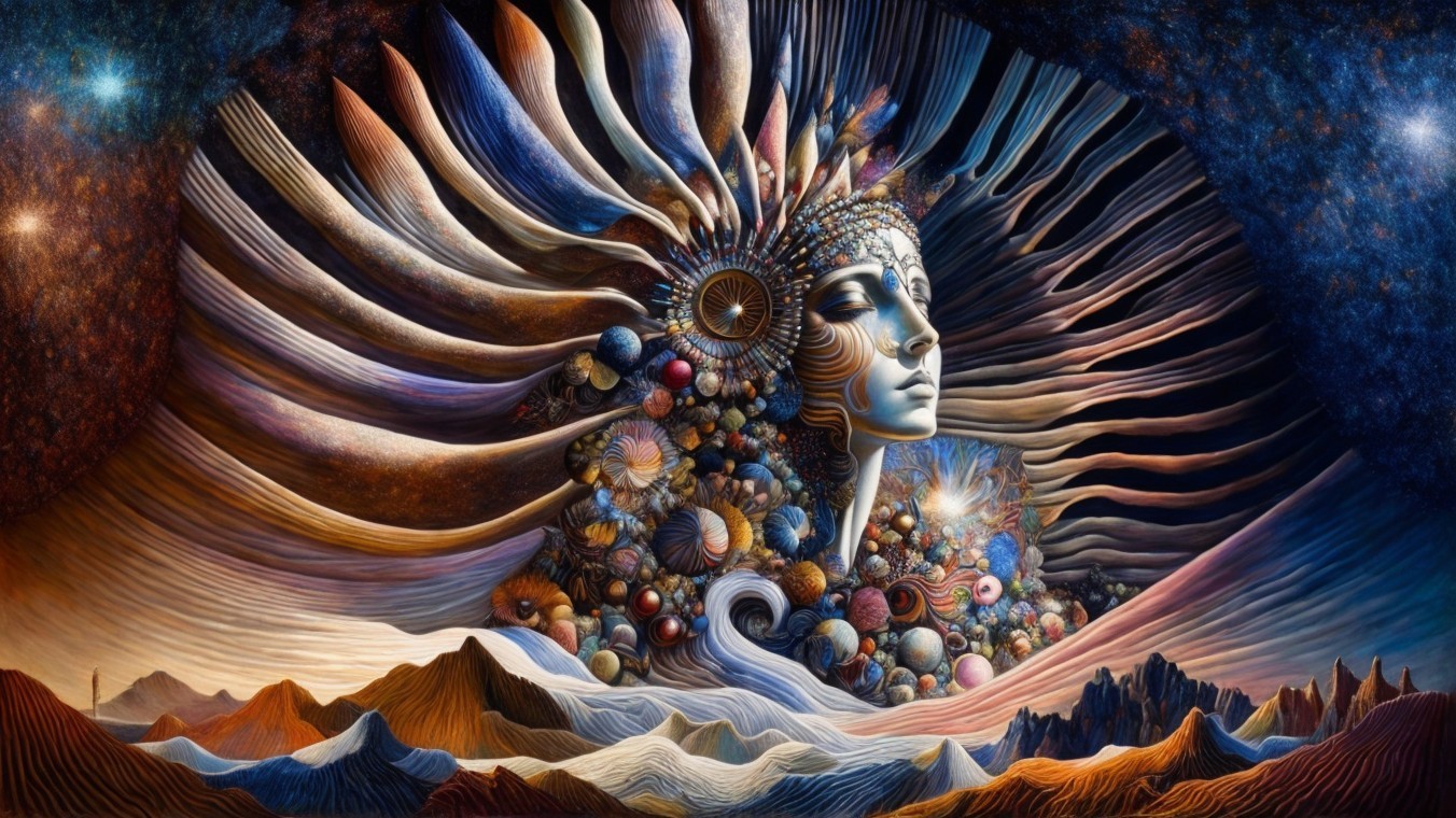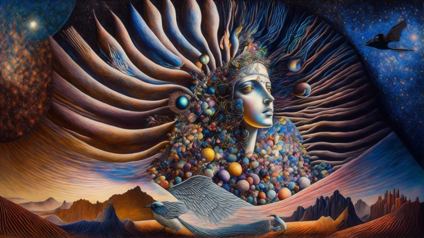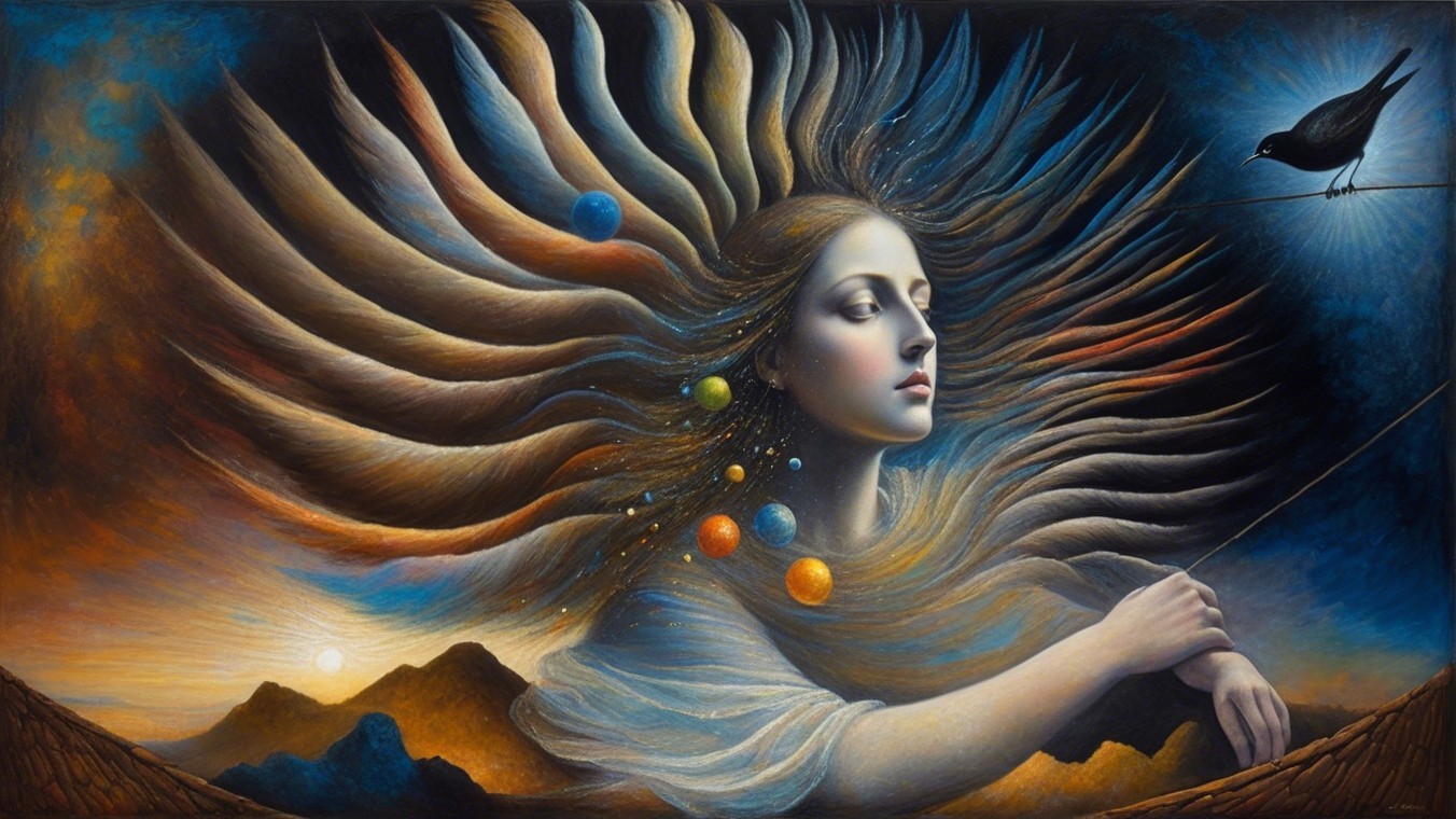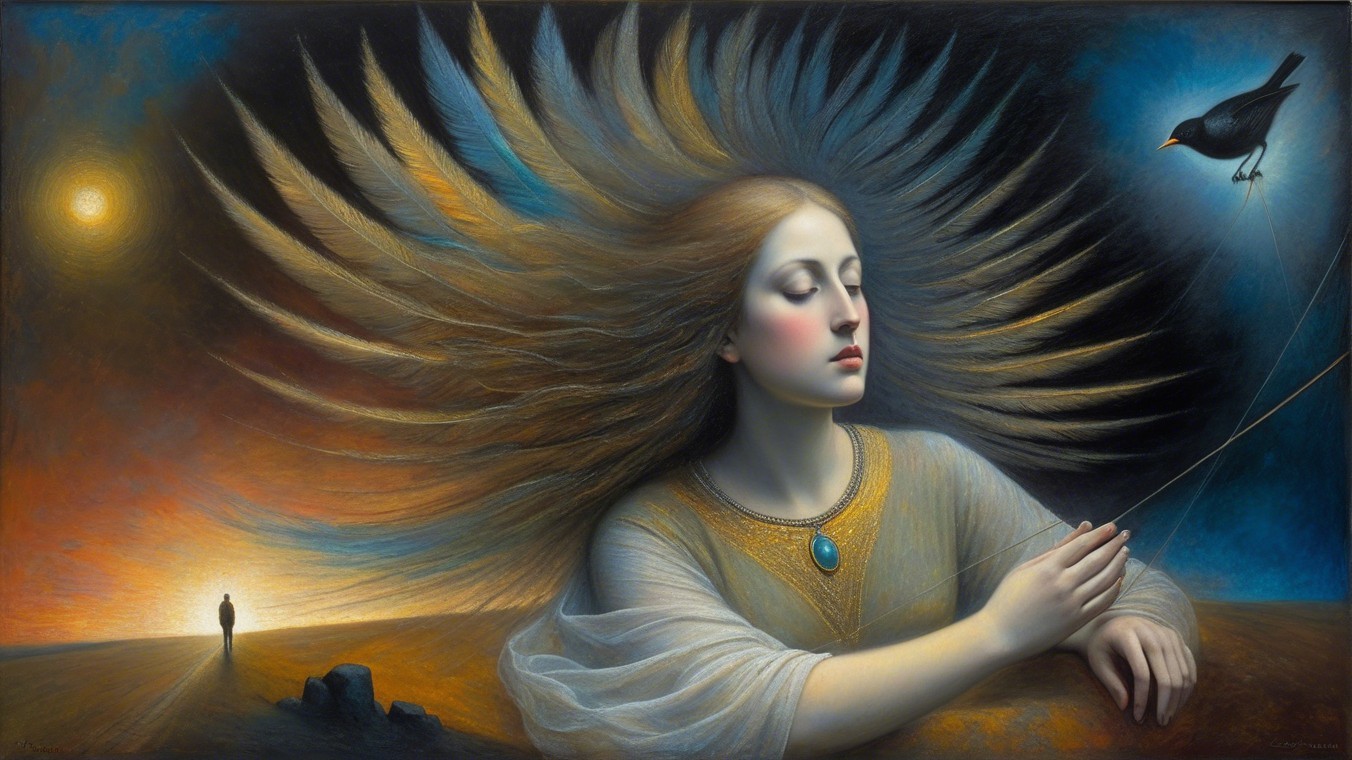 The artwork features a serene woman with angelic wings, adorned with a necklace. A bird perches on her shoulder against a backdrop of a twilight sky, blending elements of fantasy and introspection.