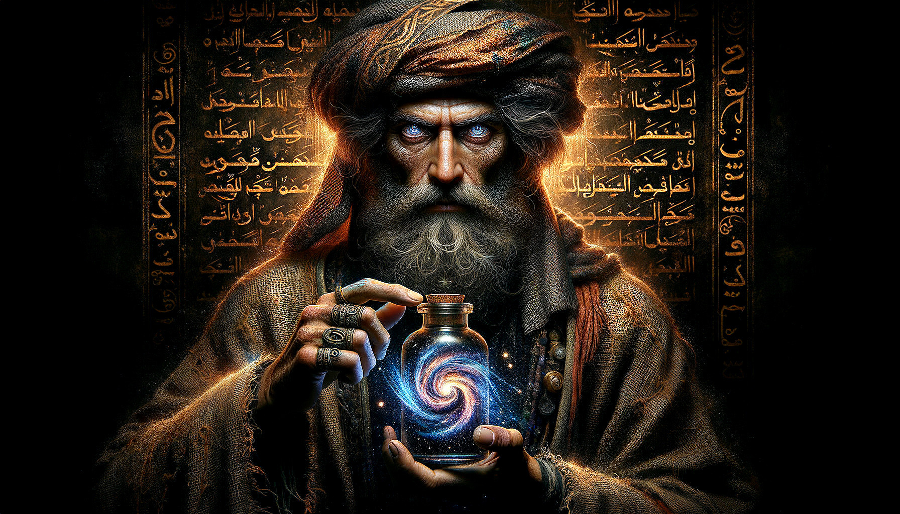 A hyper-realistic digital portrait of an ancient male sorcerer exuding charisma and mystery. The detailed artwork showcases vibrant colors, intricate features, and a mesmerizing background with ancient symbols and stars.