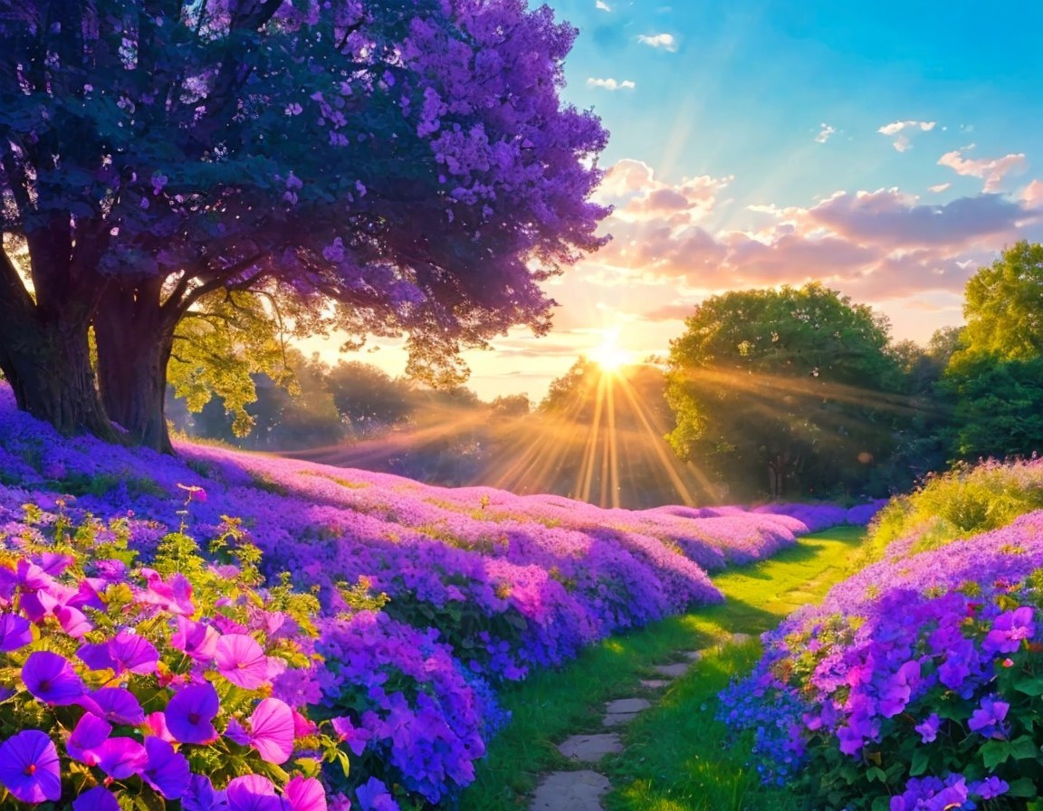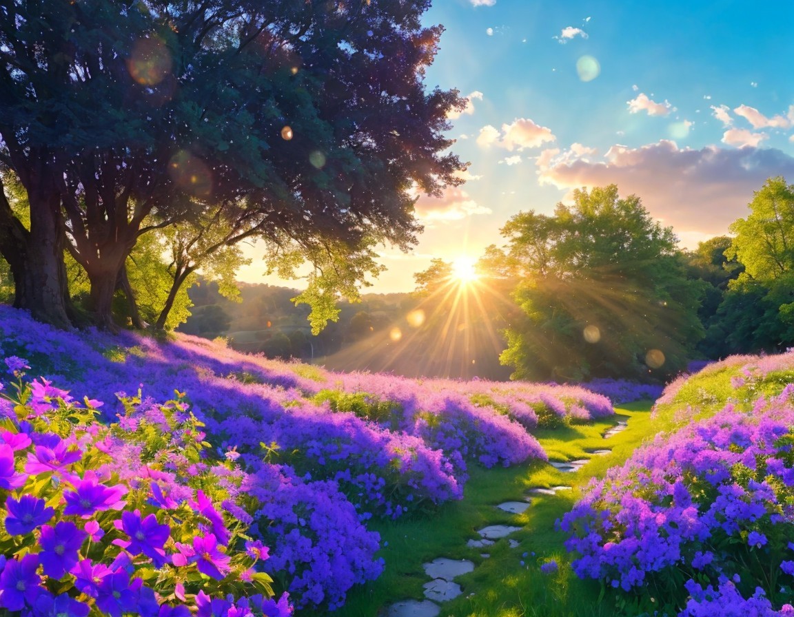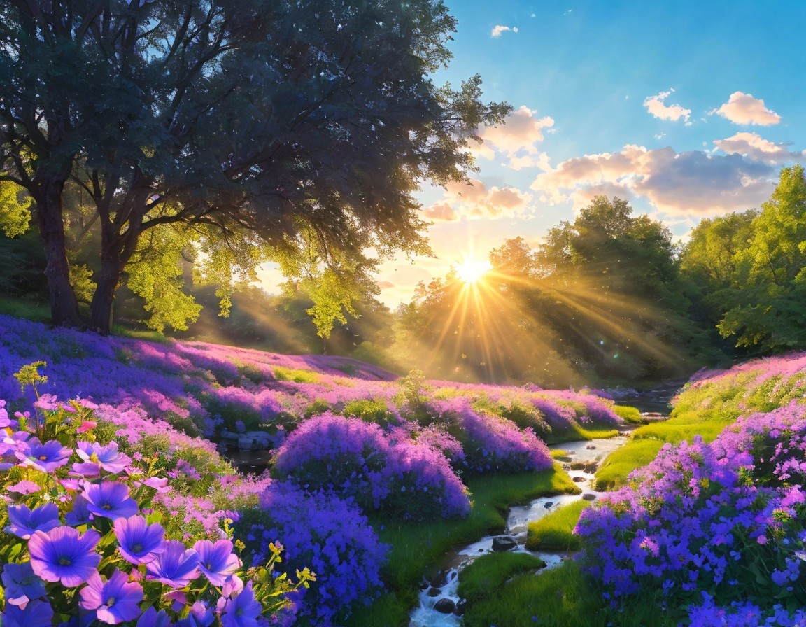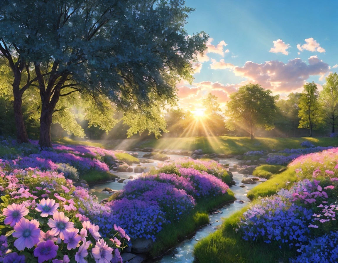A tranquil scene of a vibrant landscape at sunrise, featuring a gentle stream surrounded by blooming flowers and lush greenery, with soft sunlight filtering through the trees.