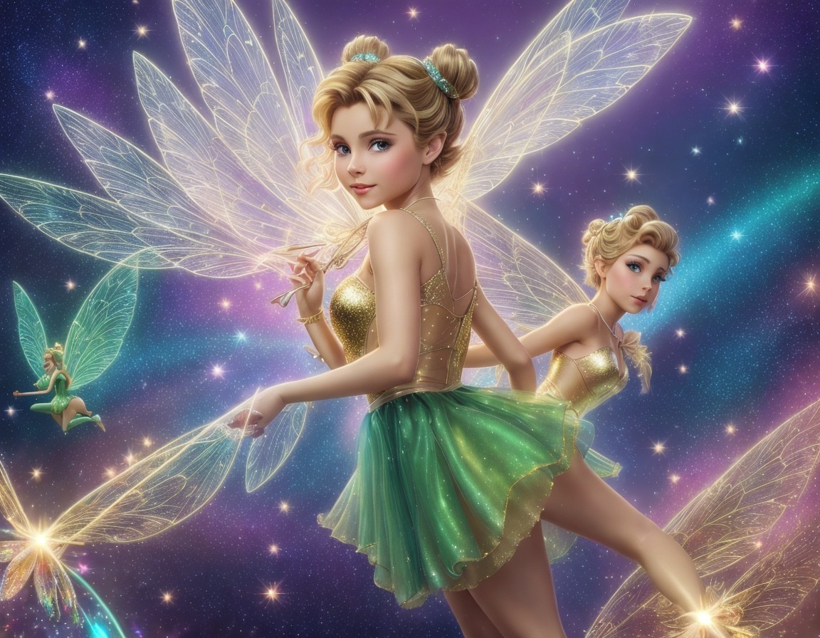 An illustrated fairy with translucent wings on a starry, colorful cosmic background, wearing a green dress with a regal pose.