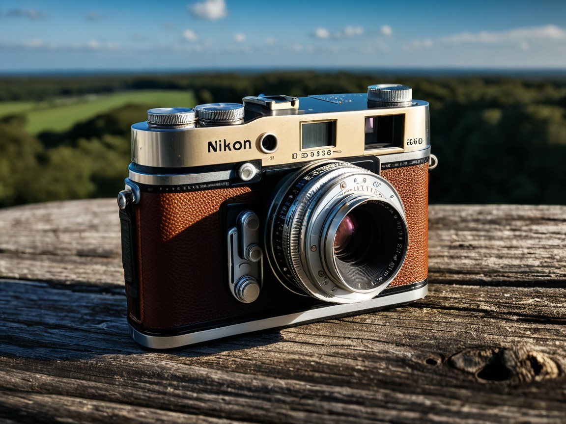 A vintage camera named "Pluto" rests on a wooden surface, showcasing its elegant design with leather accents. The scenic background features rolling green fields under a blue sky.