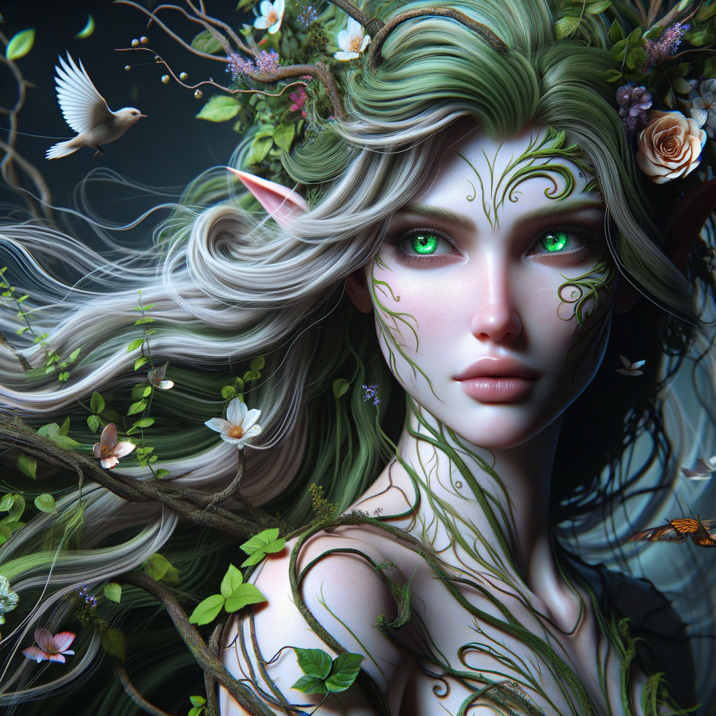 A serene figure with long, flowing silver hair adorned with flowers and greenery. Her striking green eyes gaze thoughtfully, accompanied by a delicate dove and a butterfly in a lush, enchanting setting.