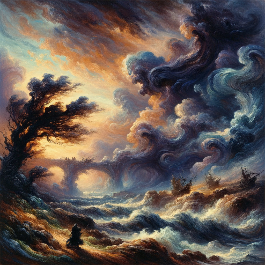 A dramatic seascape depicts a lone figure gazing at a turbulent sky filled with fiery clouds. Waves crash against rugged cliffs, while a distant castle adds a touch of mystery to the scene.