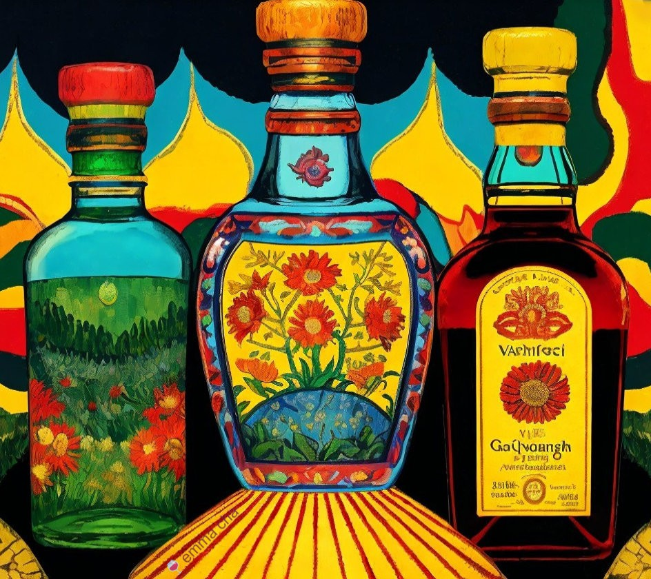 This still life showcases three artistically decorated bottles with floral motifs and vibrant colors, celebrating the beauty of vintage glassware. The bold, textured backdrop complements the intricate patterns on each bottle, creating a fusion of classic and contemporary aesthetics inspired by various art movements.
