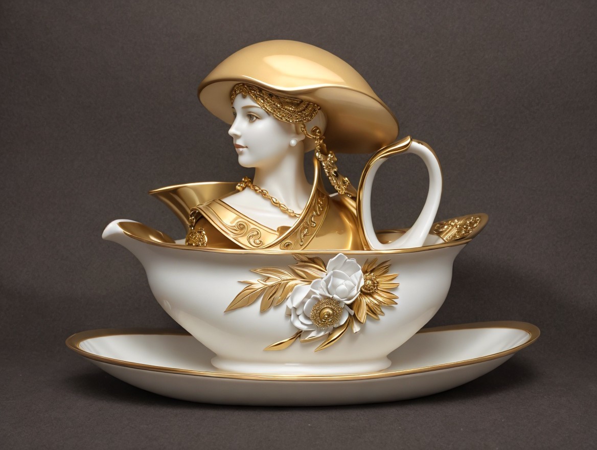 A decorative porcelain teacup set with a female figure as the handle, adorned with gold accents and white roses, on a matching saucer.