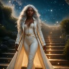 A stunning figure in a shimmering silver gown with a flowing cape stands on grand steps under a starry night sky, radiating elegance and confidence.