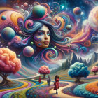 A surreal landscape features a giant, serene female face emerging from colorful mountains. Vibrant flora and distant planets create a mystical atmosphere, with three figures walking along a winding path.