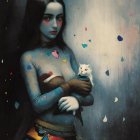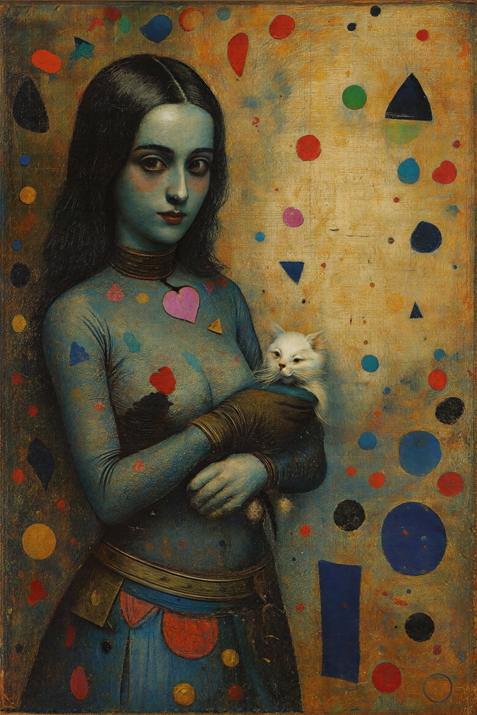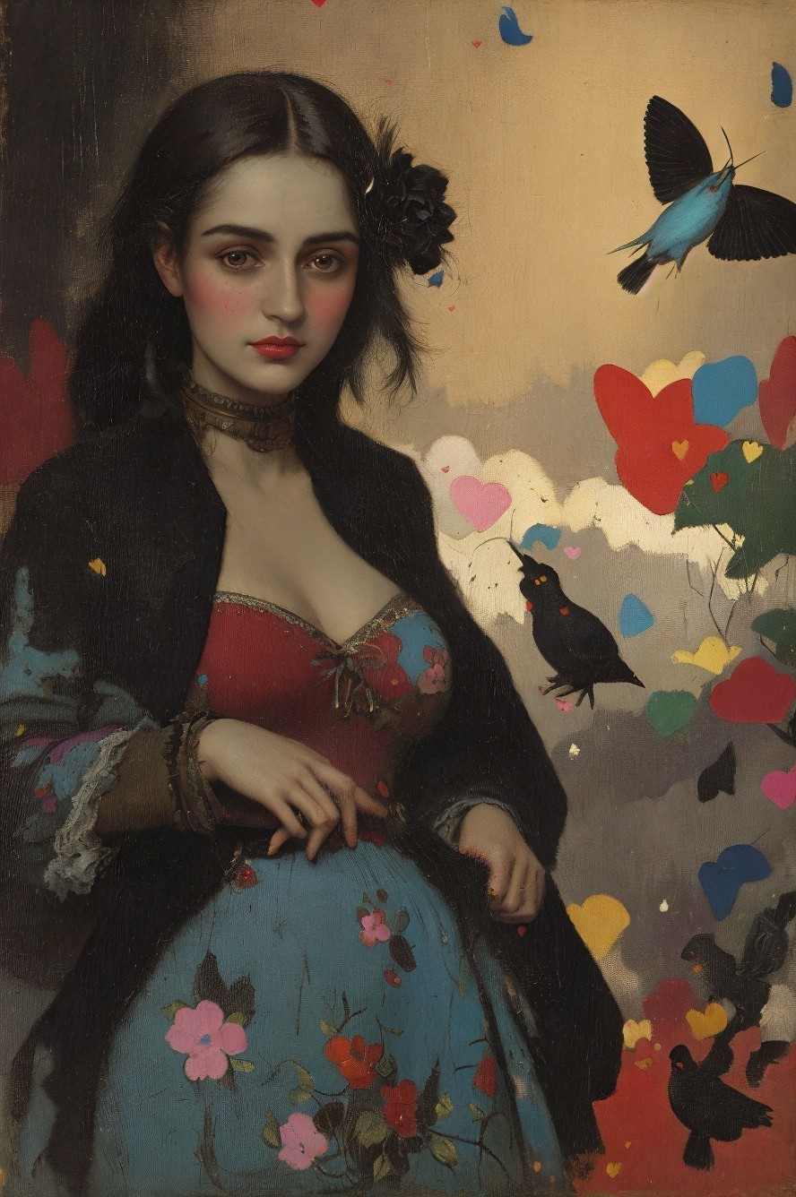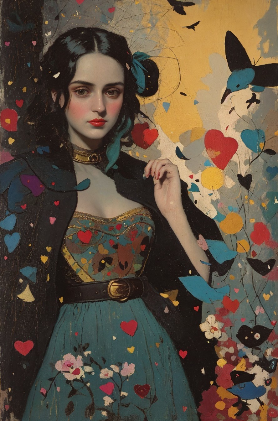A portrait of a young woman with fair skin, dark hair, and brown eyes, wearing a black coat decorated with colorful hearts and a teal dress, with colorful hearts and birds in the background, in the style of abstract expressionism and pop art