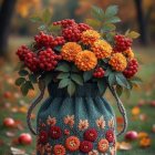 A cozy green basket adorned with a vibrant flower design, filled with bright orange flowers and red berries, surrounded by fresh red apples and autumn leaves.