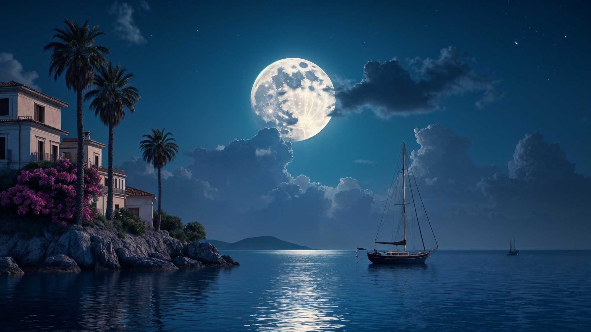 A serene night scene features a large full moon illuminating a calm sea, with palm trees and a charming villa adorned with flowers. Nearby, sailboats gently sway on the water under a starry sky.