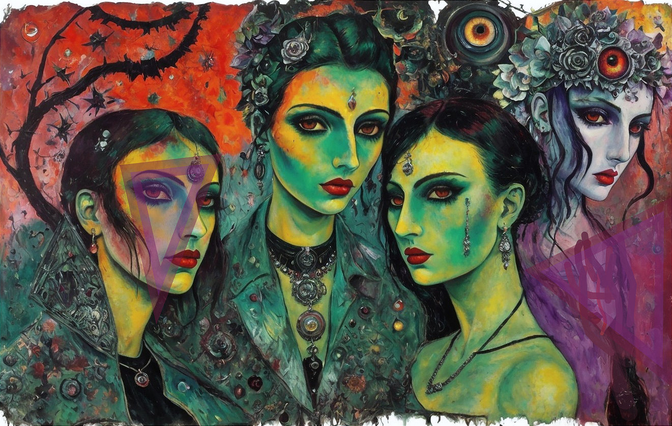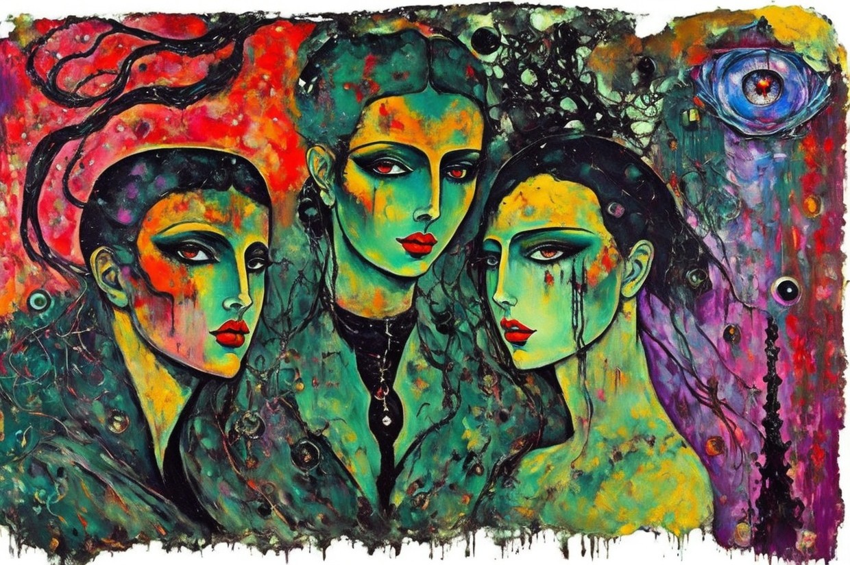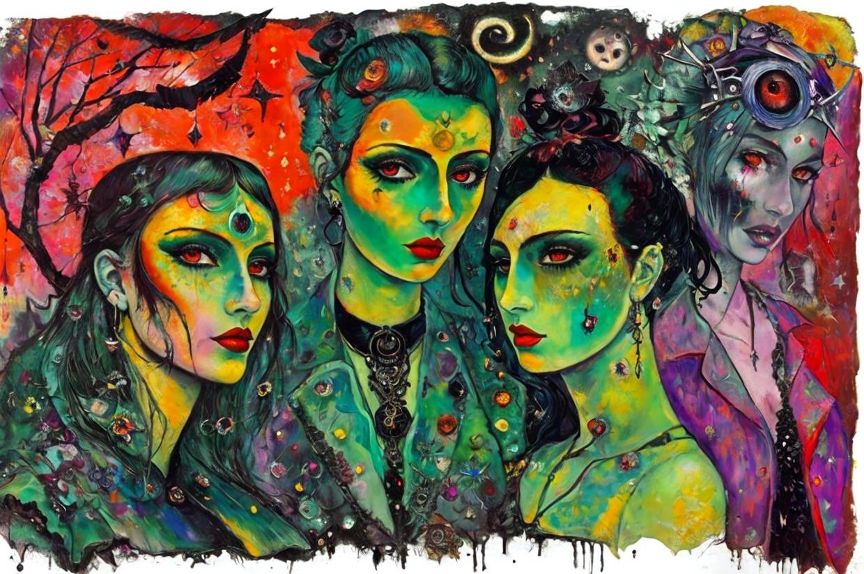 A vibrant painting of four stylized women with decorative headpieces and colorful, adorned attire set against a vivid, abstract backdrop.